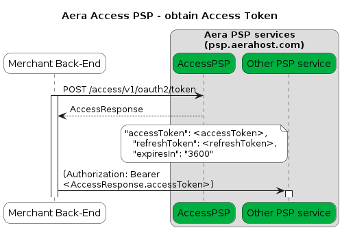 Access PSP is an application used to obtain an access token needed to use other Aera PSP services (psp.aerahost.com). By being authenticated using a valid clientId (username) and clientSecret (password), you’ll get an accessToken and a refreshToken back. The accessToken can then be used in the Authorization header as the Bearer token.