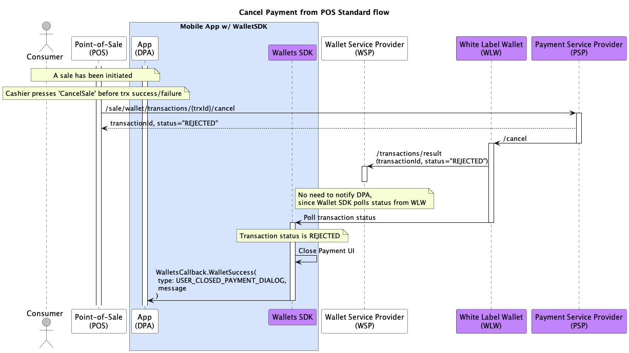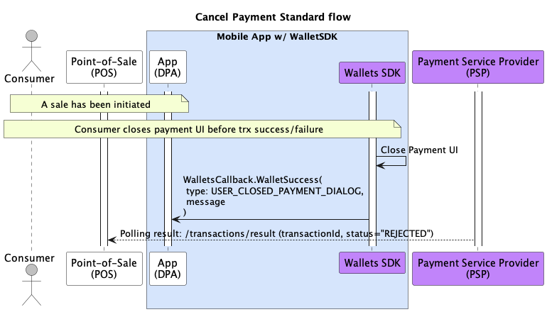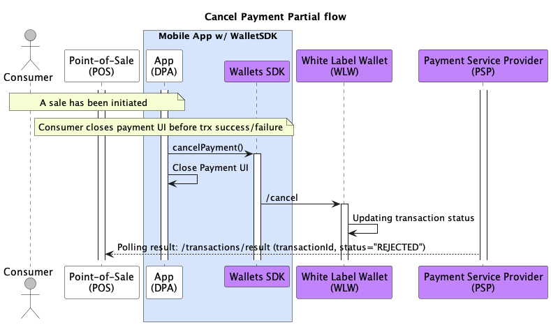 While no Wallets SDK methods are directly involved, Membership App should handle/know about cancellations done by the consumer from the Wallets SDK Payment UI or the Merchant Store.