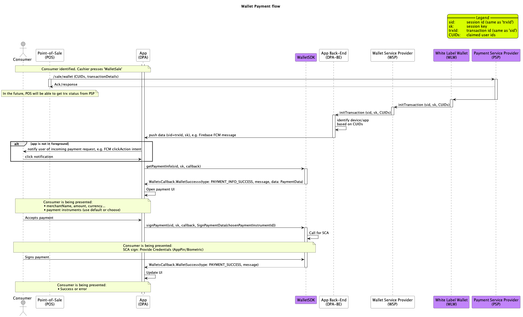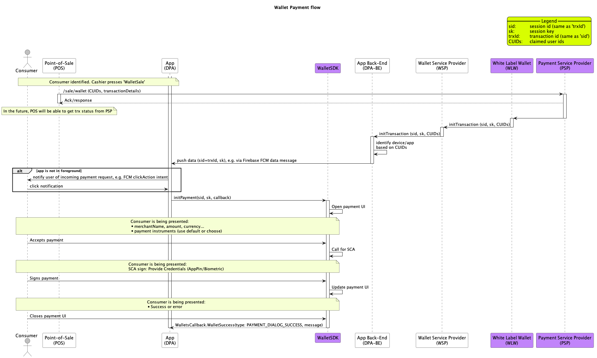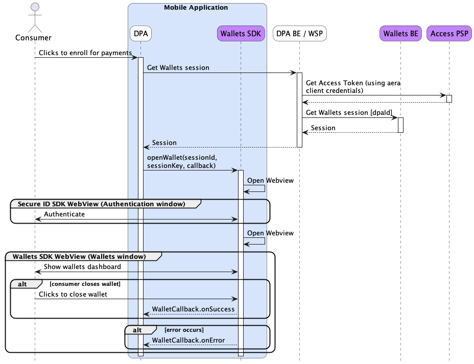 Internal dialog between Wallets SDK and WLW is hidden to avoid diagram complexity.