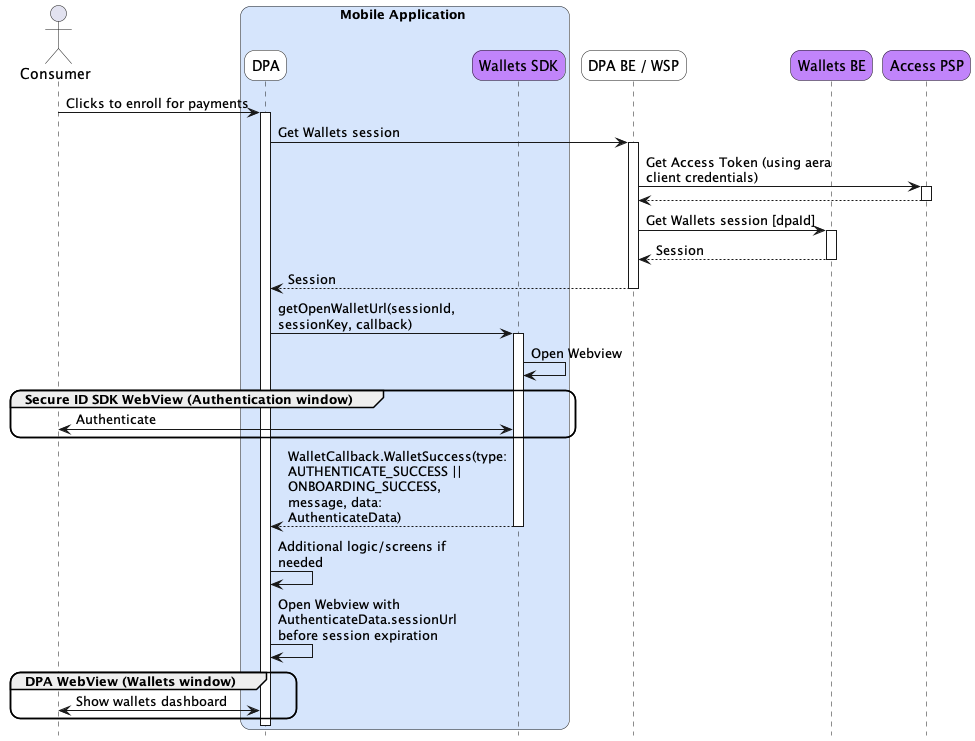 Enables the Mobile App to display their own intermediate screens between onboarding/authentication and viewing the Wallets Dashboard, but requires the Mobile App to open the Wallets Dashboard from their own application via a WebView.
